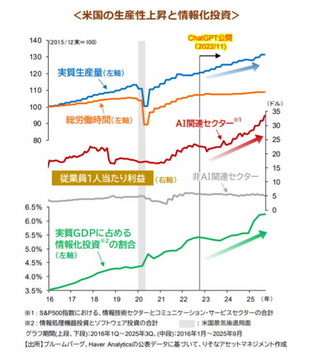 市場では企業のAI導入が収益力向上に寄与できるかを見定める段階に入っています。AI関連セクターの従業員1人当たり利益(実質EBIT※1/従業員数)は大きな伸びを見せています(下図中段)。 AI投資を中心とする情報化投資は拡大が続いており、今後はより幅広い業種で更なる生産性の上昇が期待されます(下図下段)。