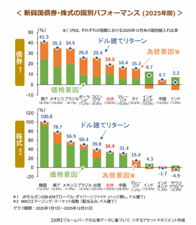 新興国債券・株式市場の2025年年間パフォーマンスは、それぞれ+19.3%、+34.4%(下図)と、5年ぶりに揃って先進国(同+3.8%、+18.6%)を上回りました。その要因は、主に3点あります。