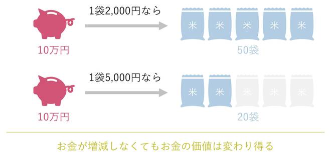 仮に、銀行口座に10万円を預けていた場合、以前ならお米を50袋(一袋2,000円)も買えていたのが、20袋(一袋5,000円)しか買えなくなります。つまり、お財布の中の現金だけでなく、銀行に置きっぱなしのお金の価値(購買力)も減っているのです。