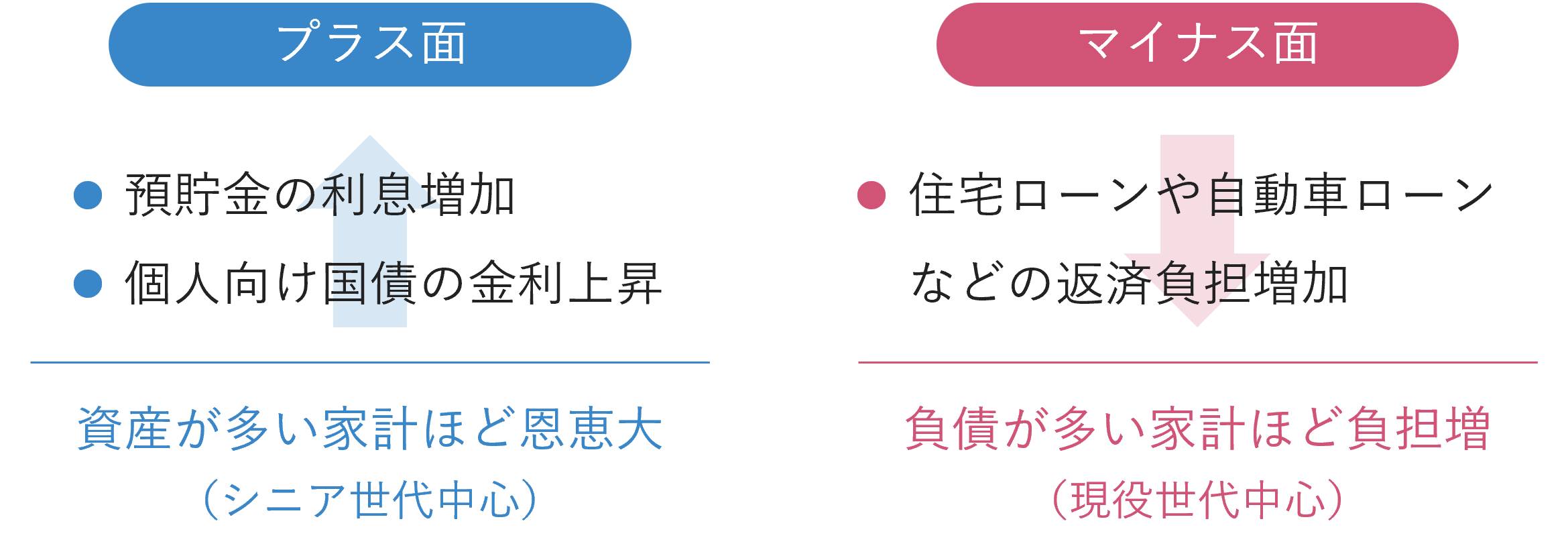 そして金利上昇のプラス面としては、預貯金の利息や債券の金利収入が増えることなどが挙げられます。シニア世代を中心に、すでに多額の預貯金などを持っている人ほど、プラスの効果が大きいでしょう。一方、住宅ローンやマイカーローン、教育ローンなどを使ってお金を借りる人の返済負担が重くなるのは、金利上昇のマイナス面だといえます。