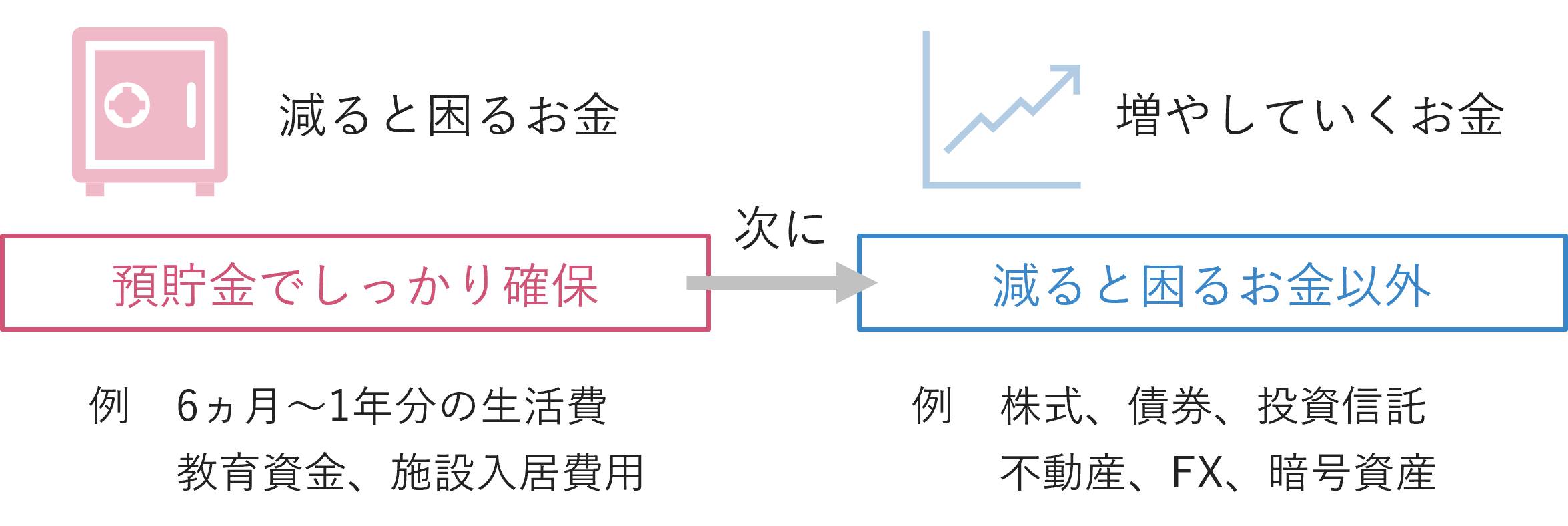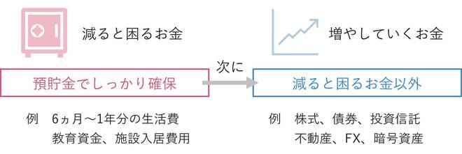 そこでまずは、「減ると困るお金」の特定から始めましょう。最初に生活費の6ヵ月~1年分や予定している大きな支出、教育費、介護施設への入居金などを安全資金として現預金で確保します。そのうえで、残りを運用に回す比率として決めていくという順番です。
