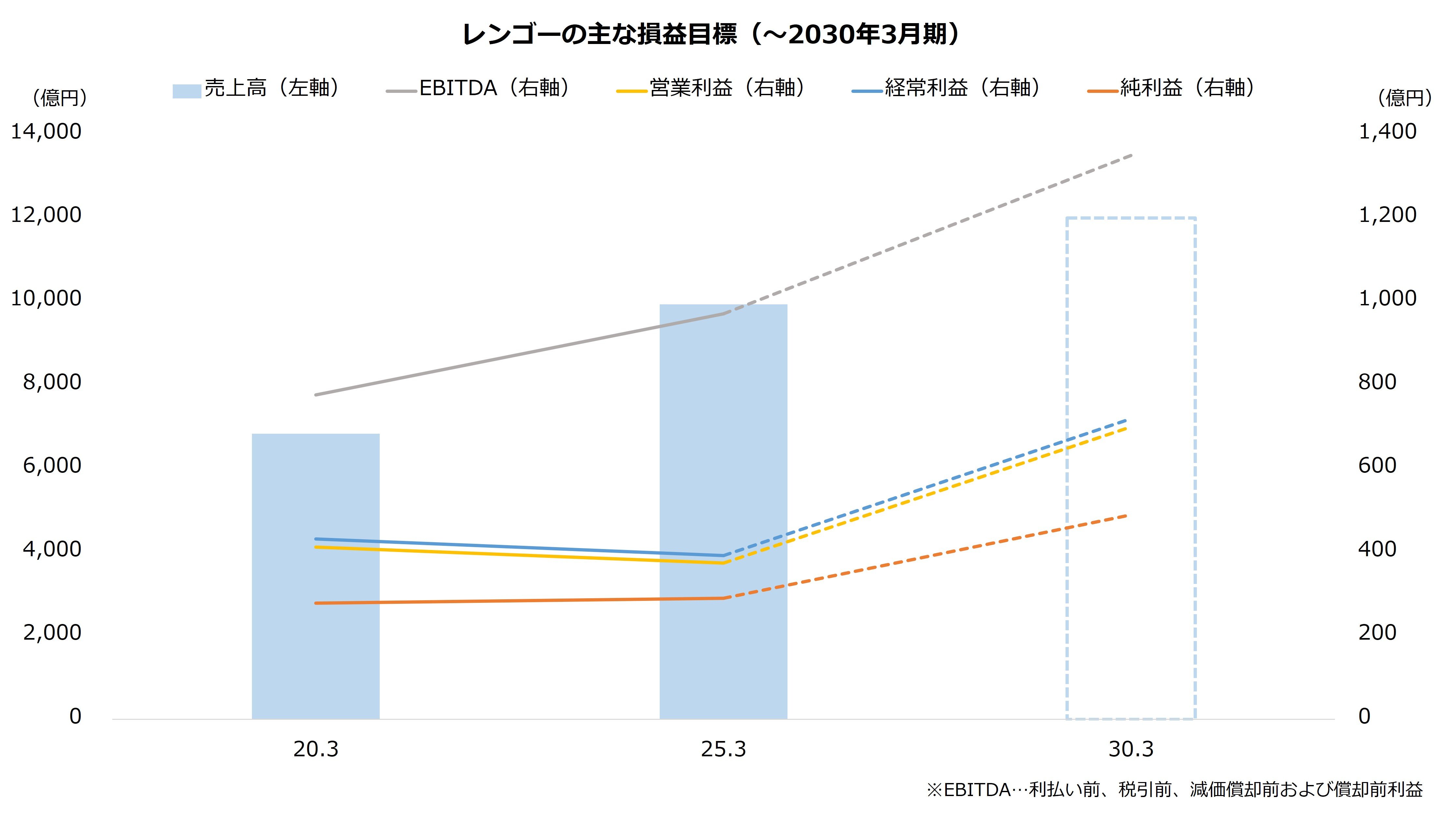 続いて、より長期の見通しも確認しましょう。レンゴーは25年5月、30年3月期を最終とする中期経営計画を公表しました。売上高は1兆2000億円、営業利益と経常利益はそれぞれ700億円および720億円を目指す計画です。