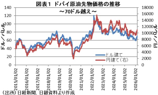 イラン情勢の緊迫化により、原油価格高騰が懸念されている。実際、週明けのWTIは1バレル=70ドル台を上回る水準で推移しており、今後の経済活動に影響が及ぶことが警戒される(図表1)。