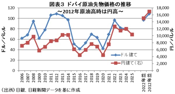 そこで、より現実的な家計への影響について、今後のドル円レートを不変と仮定し、今年度後半以降の原油価格の水準を場合分けして試算すれば、今年3月以降の原油先物価格が直近1年平均の67ドル/バレル程度に落ち着けば、10か月後となる27年の消費者物価前年比への影響は不変となる。しかし、今後1年間の原油先物価格がロシアのウクライナ侵攻のあった2022年平均並みの97ドル/バレル台、もしくは核開発問題をめぐる西側諸国とイランの混乱があった2012年平均並みの109ドル/バレル程度で推移したとすれば、直近1年間の平均ドル建て原油価格は前年比でそれぞれ+45%、+64%になる(図表3)。