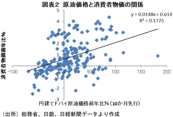 以下では、家計への影響を見てみよう。原油価格が上昇すると、タイムラグを伴って消費者物価へ押し上げ圧力が強まることがわかる。事実、2006 年1月以降の原油価格と消費者物価の相関関係を調べると、円建てドバイ原油価格の+1%上昇は10か月のタイムラグを伴い消費者物価を約0.015%程度押し上げる関係がある(図表2)。
