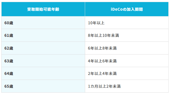 なお給付金の受取可能年齢は基本的に60歳からだが、以下の表のとおり、厳密には加入期間によって変わるので注意が必要だ。これも制度の大前提が長期的な資産運用であることを考えれば納得できるだろう。