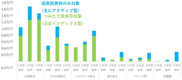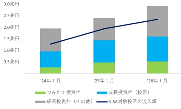 日本証券業協会が公表している証券10社の金額を見ると、2年目以上に買付が行われたことが確認できます(図表1の棒グラフ)。また、NISA対象投信(ETFを除く)への資金流入を見ても、NISA口座以外の売買も含まれる金額ですが、26年1月は約2兆3400億円となっています。1年目である24年1月が約1兆2800億円、2年目の25年1月が約1兆9400億円でしたから、着実に増加しています(図表1の紺線)。