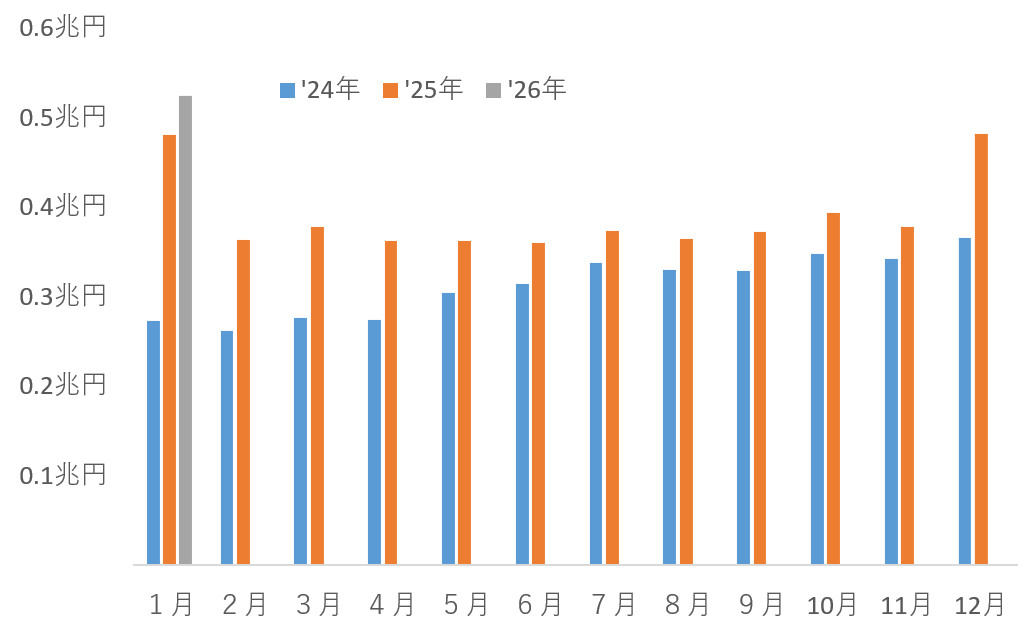 その大きな要因は米国株式人気の一服です。25年1月は米国株式が非常によく買われていたのですが、26年1月も確かに大規模な買付自体は入っているものの、「25年1月と比べると、だいぶ減った」といえます。25年1月には1兆700億円を記録したのに、26年1月は5500億円とほぼ半減していることからもお分かりになると思います。