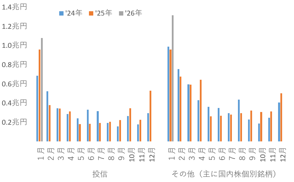 もっとも買われていたのが、外国株式という点は24年1月から変わりません。ただ、25年1月には1兆6900億円の流入があったのに、26年1月は1兆4800億円と2100億円鈍化しました。