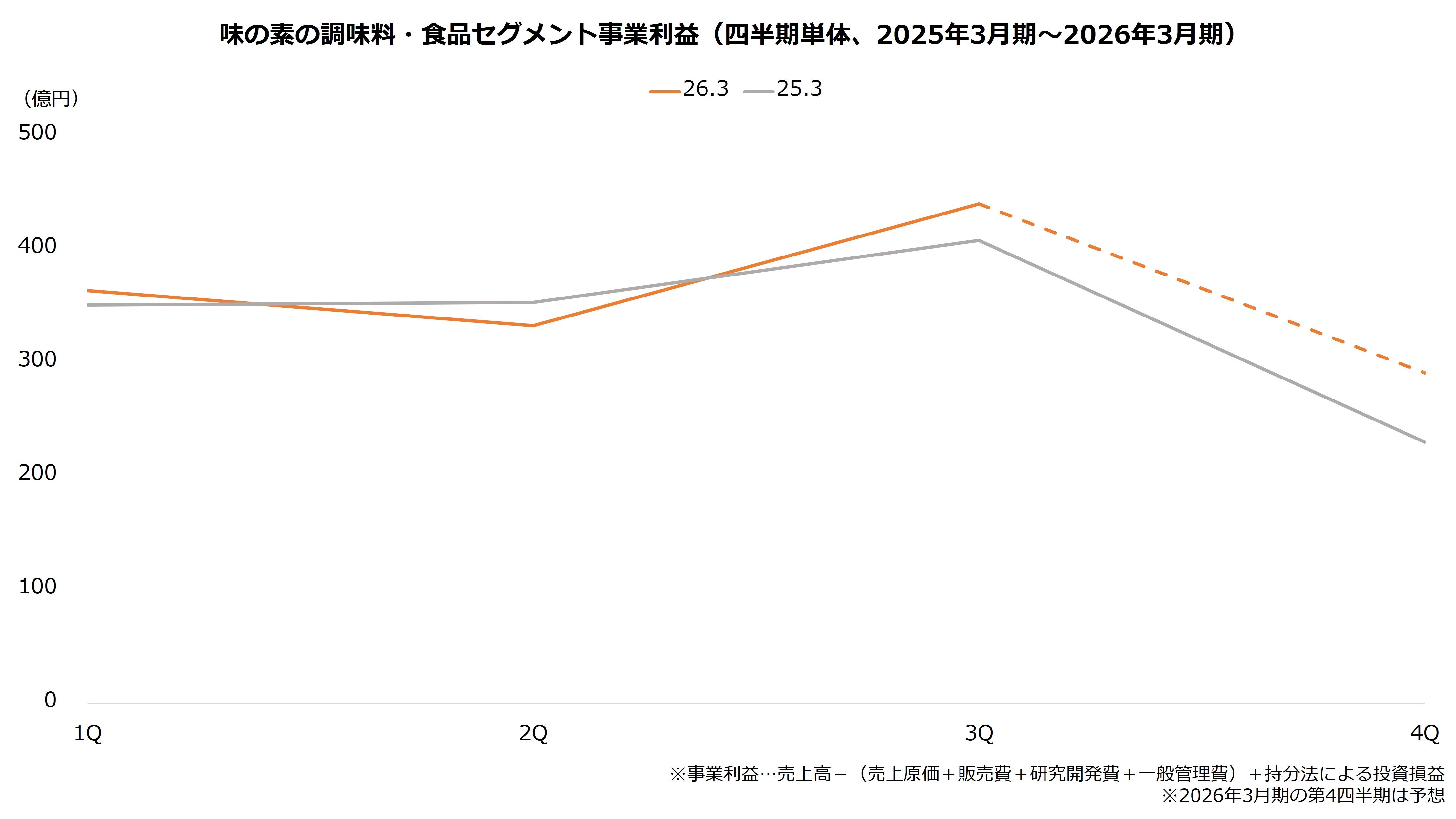 好調は第4四半期も続く見通しです。決算では通期の利益見通しが上方修正されており、調味料・食品セグメントは従来の1391億円から1426億円へ上振れる見込みとなりました。第4四半期単体のセグメント利益は、前年同期比26.6%増と高い成長が続く計算です。