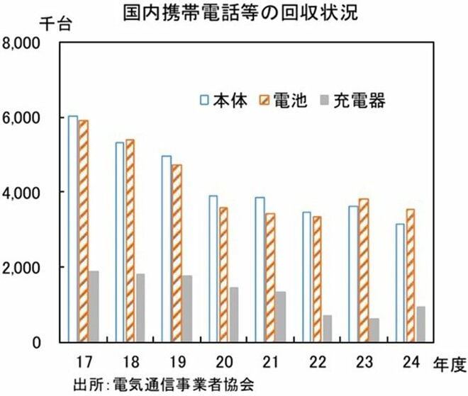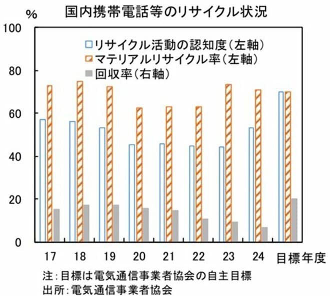 神様:その一方で、都市鉱山は眠ったままでもあるのです。携帯電話などの回収状況は停滞しています。回収後に資源化される割合を示す「マテリアルリサイクル率(資源化率)」は、電気通信事業者協会が自主目標としている70%を超えています。一方でリサイクル目的で回収された端末の割合を示す「回収率」は低調です。