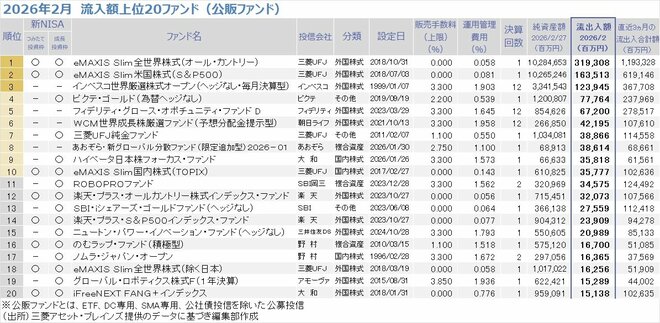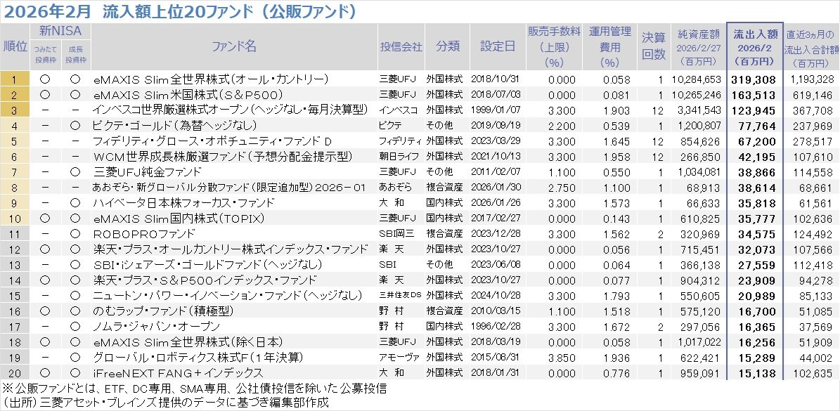 流入額上位20ファンドでは、トップ2は前月同様に三菱UFJアセットマネジメントが設定する「eMAXIS Slim 全世界株式(オールカントリー)(愛称:オルカン)」(流入額3193億円、前月5890億円)と「eMAXIS Slim 米国株式(S&P500)」(同1635億円、2948億円)だった。ともに純資産総額が10兆円を超える超大型ファンドだが、直近3カ月の資金流入額では「オルカン」の1兆1933億円に対して「eMAXIS Slim 米国株式(S&P500)」は6191億円と約2倍の差がついてしまっている。