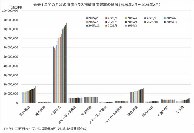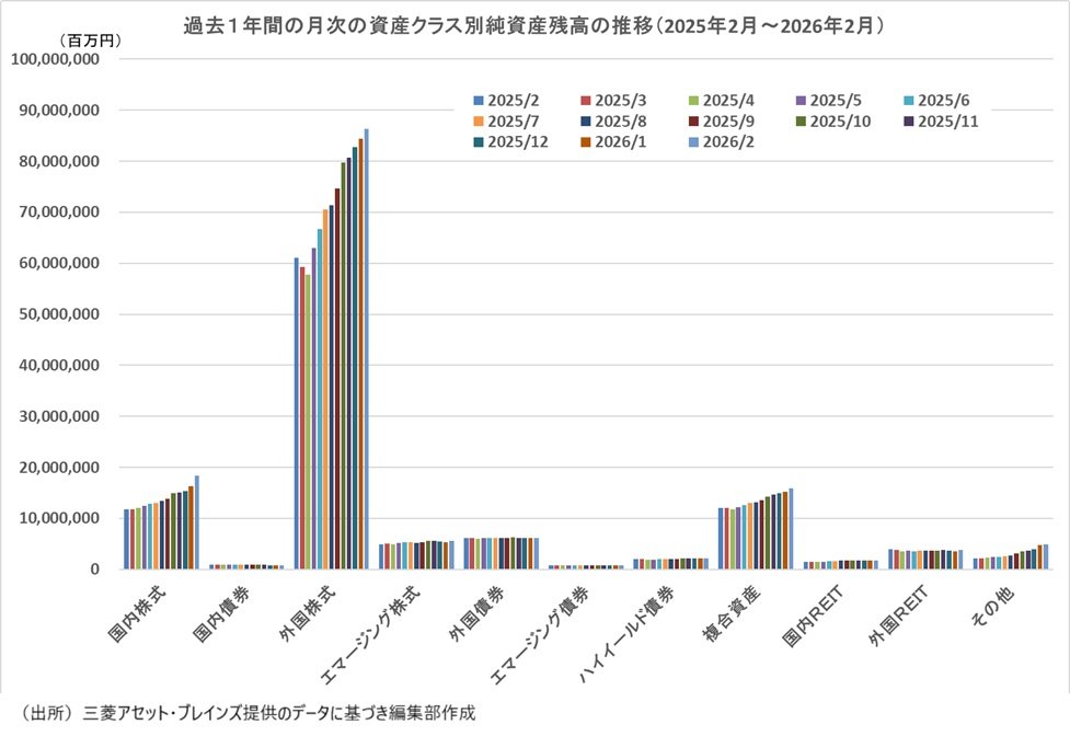 三菱アセット・ブレインズがまとめた2026年2月の公販ファンド(ETF、DC専用、SMA専用、公社債投信等を除いた公募投信)の純資産残高は約146兆7152億円で前月比約5兆2703億円増加した。純資産残高は10カ月連続で増加し、前月に続いて史上最大を更新した。純資産残高の増加額は前月の約3兆6888億円から約1兆5816億円増加した。「国内株式」が約2兆358億円(前月は約1兆108億円)の増加と残高を大幅に拡大した。「外国株式」は約1兆8750億円(同約1兆6948億円)と引き続き力強く残高を拡大している。「複合資産」も約6266億円(同約3813億円)の増加、純金ファンドなどが含まれる「その他」が約1215億円(同約8931億円)だった。また、前月は約578億円減少だった「外国REIT」が約2481億円の増加に転じた。「国内債券」は約43億円の増加(同約137億円減少)と2024年8月以来18カ月ぶりに残高が増加した。