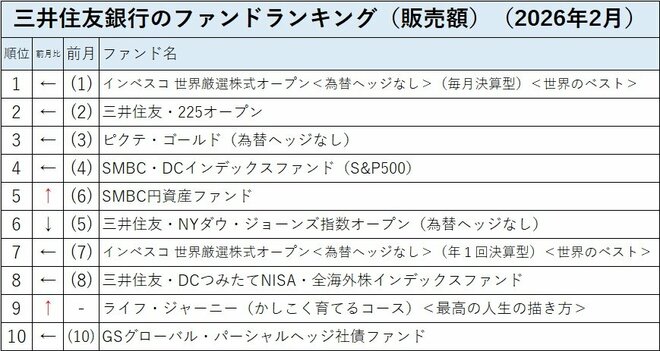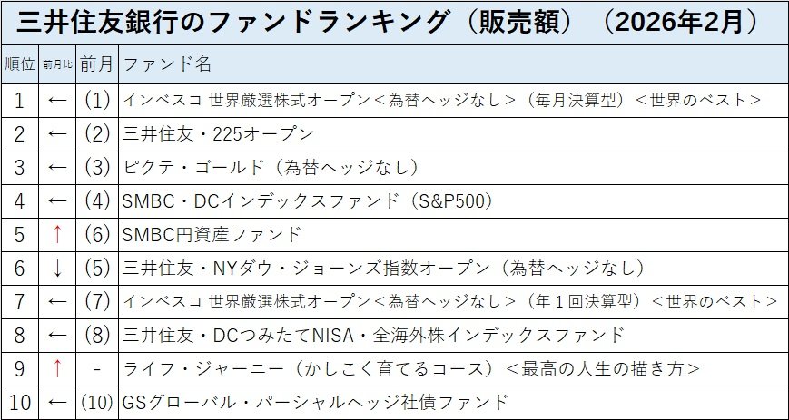 三井住友銀行の投信売れ筋ランキングの2026年2月のトップ10は前月とほぼ同じだった。トップの「インベスコ 世界厳選株式オープン<為替ヘッジなし>(毎月決算型)<世界のベスト>」、第2位の「三井住友・225オープン」の他、第4位までは前月と同じ。わずかな変化は、前月第5位と第6位が入れ替わり、「SMBC円資産ファンド」が第5位に上がり、「三井住友・NYダウ・ジョーンズ指数オープン(為替ヘッジなし)」が第6位に後退。また、第9位だった「ピクテ・ゴールド(為替ヘッジあり)」がトップ10圏外に落ち、トップ10圏外から「ライフ・ジャーニー(かしこく育てるコース)<最高の人生の描き方>」が第9位に上がった。