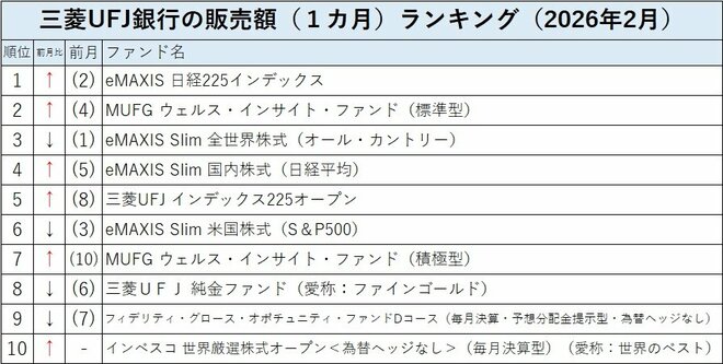 ※三菱UFJ銀行のサイト内の投資信託検索サイト、「ファンドランキングから探す」の「販売額:1カ月」に基づき編集部作成。期間は2026年2月。