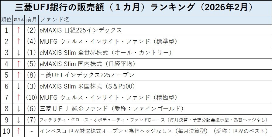 三菱UFJ銀行の販売額(1カ月)ランキング2026年2月のトップは前月第2位だった「eMAXIS 日経225インデックス」が返り咲いた。第2位には前月第4位だった「MUFGウェルス・インサイト・ファンド(標準型)」が上がり、前月トップの「eMAXIS Slim 全世界株式(オール・カントリー)」(愛称:オルカン)は第3位に後退した。そして、第4位には前月第5位から「eMAXIS Slim 国内株式(日経平均)」が、第5位には前月第8位から「三菱UFJインデックス225オープン」が上がるなど、国内株インデックスファンドのランキング上昇が目立った。また、前月第10位の「MUFG ウェルス・インサイト・ファンド(積極型)」が第7位に浮上し、バランス型の「ウェルス・インサイト・ファンド」も順位を上げている。