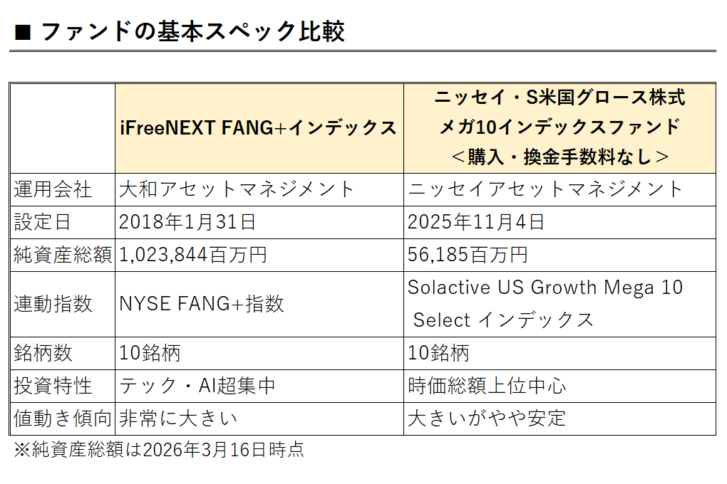 2025年12月には「iFreeNEXT FANG+インデックス」の純資産総額が1兆円を突破し、インデックスファンドの中でも超大型ファンドの一つになりました。この成功を追いかけるように少数銘柄集中投資型のファンドが設定されましたが、「FANG+」とは異なる視点で構成された10銘柄の切り口で注目を集めたのが「ニッセイ・S米国グロース株式メガ10インデックスファンド(購入・換金手数料なし)(愛称:メガ10)」です。わずかな期間で純資産残高が500億円を超え、大型化に向かっているようにみえます。