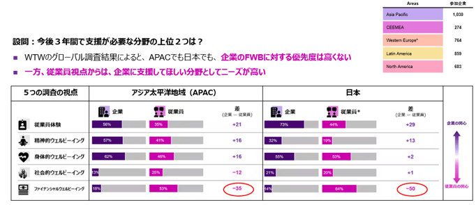 グローバル3,600社以上が参加した調査では、従業員のウェルビーイングに関連する領域について、企業が支援したい分野と従業員が支援を望む分野には大きなギャップが存在することが分かりました(図2)。中でもFWBの分野でその差が顕著で、とりわけ日本で乖離(かいり)が大きいため取り組むべき余地が十分にあります。