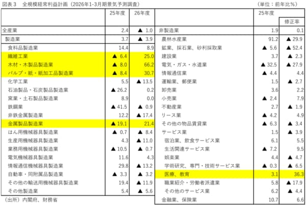 続いて、経常利益計画から26年度の業績拡大が期待される業種を見通してみよう。結果を見ると、多くの業種で減益計画となっており、これは年度明け前の企業の慎重な見通しや諸々のコスト増懸念が主因と推察される(図表3)。