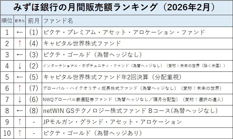 みずほ銀行の投信月間販売額ランキングの2026年2月のトップは前月と同様に「ピクテ・プレミアム・アセット・アロケーション・ファンド」だった。第2位には前月第4位だった「キャピタル世界株式ファンド」が上がり、前月第2位だった「インターナショナル・オポチュニティ・ファンド(為替ヘッジなし)(愛称:未来の世界(除く米国))」は第4位に下がった。第3位は前月同様に「ピクテ・ゴールド(為替ヘッジなし)」だった。また、トップ10圏外から「JPモルガン・グランド・アセット・アロケーション」が第9位に、「ピクテ・ゴールド(為替ヘッジあり)」が第10位にランクインした。一方、「キャピタル・インベストメント・カンパニー・オブ・アメリカ ICA」と「ピクテ・グローバル・インカム株式ファンド(毎月分配型)」はトップ10圏外に落ちた。