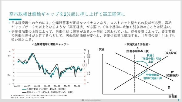 まずは、「高圧経済」についてです。企業貯蓄率と需給ギャップ(GDPギャップ)は密接な関係にあります。これまでの自民党政権では、需給ギャップがゼロになると「景気回復は十分」として経済政策を引き締めてきました。しかし、需給ギャップのゼロは単に経済のトレンドに現状が追いついただけに過ぎず、そのトレンド自体が弱いことが問題なのです。