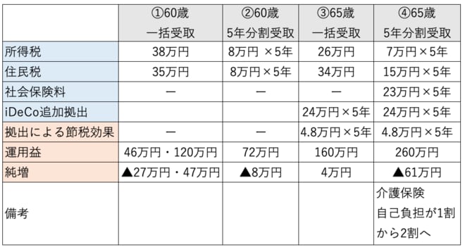 65歳までiDeCoを毎月2万円拠出するため、iDeCo資産は980万円に増える見込みです。①・②のケースでは、積立をしない設定にしているため、5年分の積立額を「iDeCo追加拠出」として差し引いています。iDeCo資産は増えますが、iDeCo加入期間が増える分、新たな退職所得控除を作ることができ所得税と住民税は①のケースより減っています。