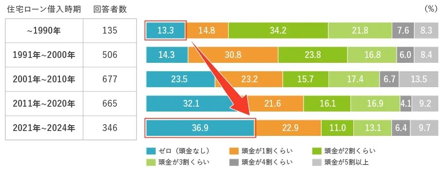 1990年までの借入れでは、「頭金ゼロ」はわずか13.3%にとどまり、「2割くらい(34.2%)」「3割くらい(21.8%)」が主流でした(図表1)。しかし、2021年~2024年の借入れでは、「頭金ゼロ」が36.9%で最も多く、「1割くらい」も22.9%と高い割合を占めています。一方で、かつて主流であった、「2~3割くらい」は合わせても24.1%にとどまります。