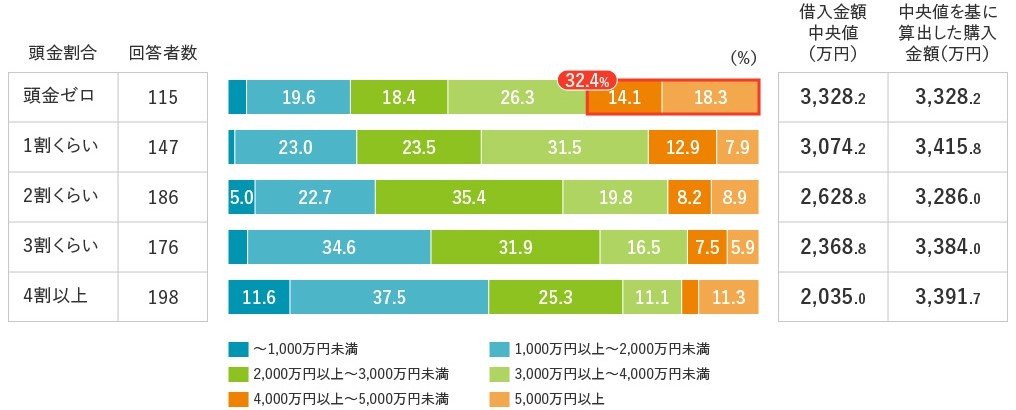 また、借入金額4,000万円以上の割合は、頭金ゼロが最も多く(32.4%)、高額な借入れが目立ちました。