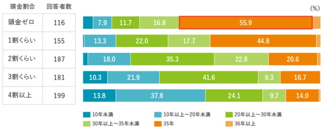借入期間についても、頭金ゼロでは「35年」での借入れが55.9%と半数を超えており、他と比較しても突出しています(図表3)。頭金割合が増えるにつれて、借入期間が短くなる傾向があり、特に頭金2割以上では、「35年」の借入期間の選択割合が急減しています。