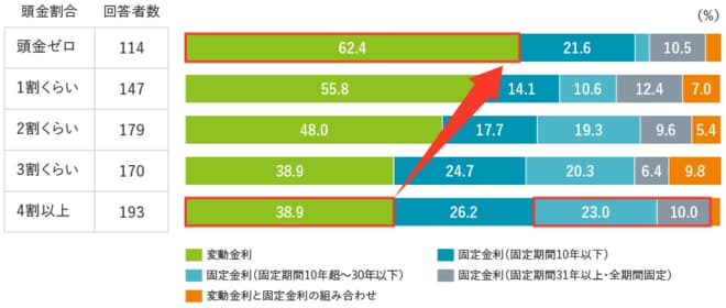 次に、金利形態については、頭金割合が少ないほど変動金利を選択する傾向が強く、特に、頭金ゼロでは変動金利が62.4%と、頭金4割以上(38.9%)のおよそ1.6倍に達しています(図表2)。一方で、頭金割合が多いほど、固定金利(特に長期固定)を選ぶ傾向が強く、金利上昇リスクを避けたいという意識や、安定した返済計画を重視する姿勢がうかがえました。