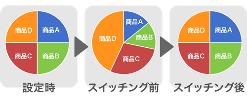 たとえば最初に「複数の資産を均等に保有する」という計画を立てて積立額を設定したとしよう。しかし投資信託は日々価格が変動する。長く運用を続けているうちに下落する資産と上昇する資産の差がついてきて、配分比率が大きく変わってしまう場合がある。そこでスイッチングを行えば、当初の計画通りの配分比率に戻すことができ、理想に近い形で運用を継続できるというわけだ。