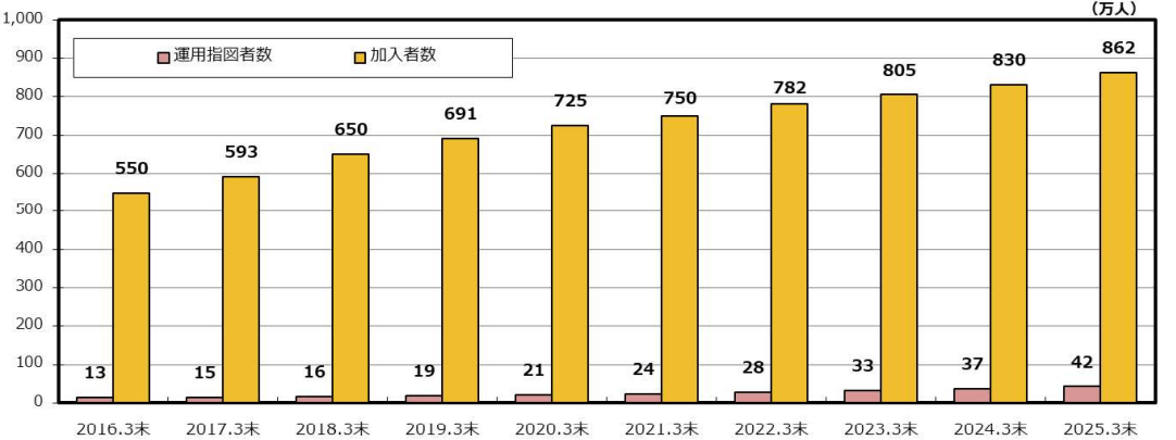 メリットの多い企業型DCだが、実際に加入者はどれくらいいるのだろうか。2025年3月末の加入者数は約862万人。日本の正社員の数は約3687万人(総務省、2026年3月公表)であるため、単純計算で約2割が加入していることになる。