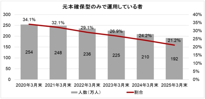 以上は資産残高でみた流れですが、この流れは元本確保型のみで運用している者の推移においても確認できます。2020年3月末には254万人、34.1%を占めていましたが、25年3月末においては192万人、21.2%まで劇的に減少しています。