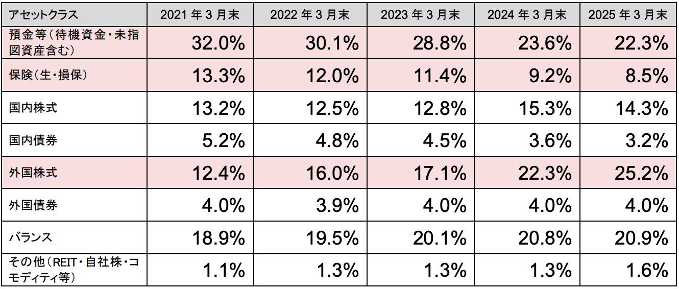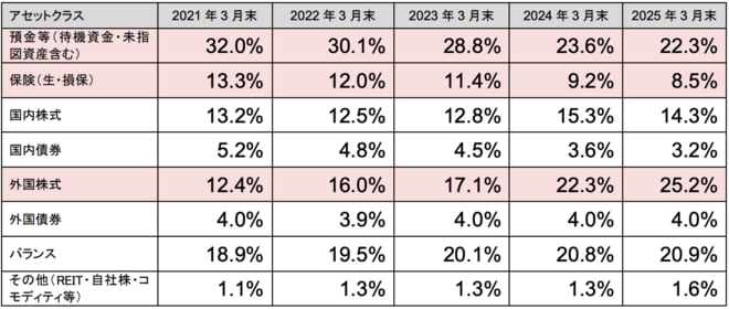 これらの変化をアセットクラスの構成割合でみると、預金等の割合が約10ポイント、保険が約5ポイント減少したのに対し、外国株式の割合は倍増の約13ポイント増など、その動きがより鮮明になります。元本確保型から投資信託への流れが続いた4年間と言えましょう。