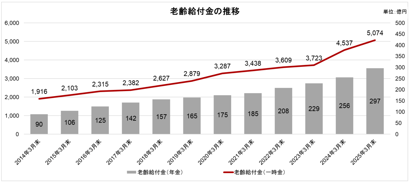 制度の成熟化とともに老齢給付金の給付額も年々増加しています(図表10)。一時金給付は2014年の1,916億円から11年間で5,074億円まで増加しています。年金給付においても90億円から297億円と大幅に増加しています。課題としては、年金給付額は一時金給付額の6.5%に過ぎないということです。年金選択率が低い傾向はDBでも同じですが、これほどの差はありません。