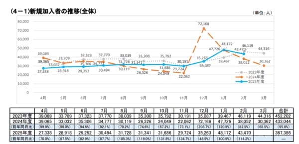 新規加入者数の内訳は、第1号加入者(自営業者等)が5404人(同132.7%)、第2号加入者(会社員・公務員)が3万6477人(同112.2%)、第3号加入者(専業主婦・主夫)が1221人(同109.6%)。全ての加入者区分で前年同月を上回った。