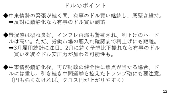 来週、最もドル円が上昇するのは、➀中東情勢の緊張が続き、➁「主な意見」より、利上げに対する日銀の慎重なスタンスが確認され、さらに、➂米国の雇用統計が予想を上回った場合です。反対に、中東情勢の緊張が和らぎ、日銀のタカ派スタンスが確認され、雇用統計が予想を下回れば、ドル円は自然に反落すると考えられます(スライド12)。