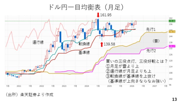 最後に先週も紹介した月足の一目均衡表を見ておきましょう。現在、図中に記した通り、「買いの三役」が点灯しています。ただ、基準線も上向きとなれば、さらなる強い上昇相場が連想されます。この基準線は直近26ヶ月間の高値と安値の平均ですから、ドル円が2024年7月高値の161円95銭を上抜けすると基準線が上向きとなります。当面、ドル円がこの161円95銭を上抜けするか、大いに注目です(スライド13)。