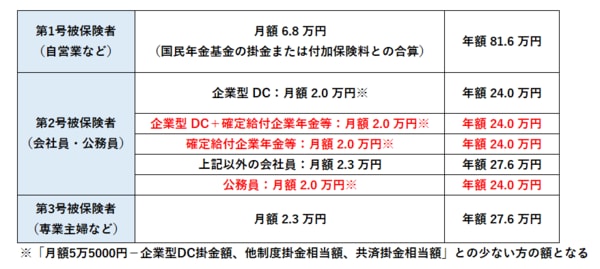 井出 そのとおり。2024年12月に掛金の拠出限度額が変更されました。会社員の方の中でこれまで月額1万2000円が上限だった方は2万円にアップ(変更点:下表の赤字部分)。具体的には、DB(確定給付企業年金)等の他制度に加入している方と公務員の方が当てはまります。