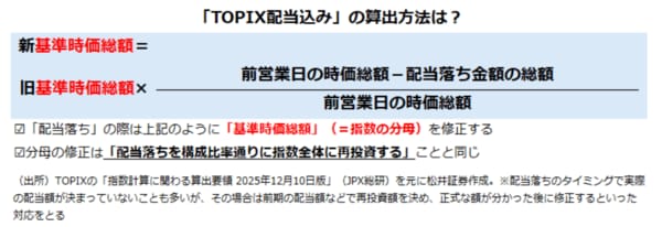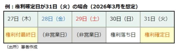 そもそも、配当込み指数とはどういうものか。まずは株主の立場で、株式の配当を受け取るフローをおさらいしてみよう。権利付最終日の翌営業日、2026年で言えば3月30日は「配当落ち日」と言われる。配当を受け取る権利がなくなることから、理論上は配当分、株価は下がる。「配当落ち」や「権利落ち」などと言われる。
