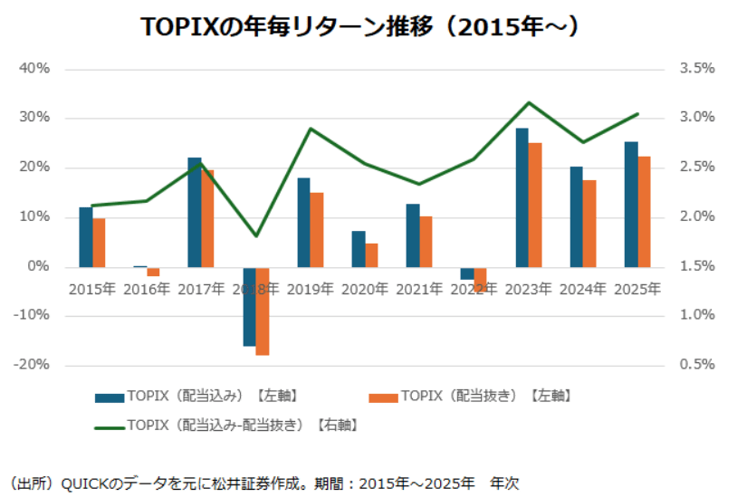 我々が普段、目にする株価指数、例えば日経平均株価や東証株価指数(TOPIX)などの多くは配当を考慮しない「配当抜き」のタイプだ。これらにも配当込み指数はあるが、証券業界や資産運用業界の関係者でもない限り、存在すら知られていないのに等しい。