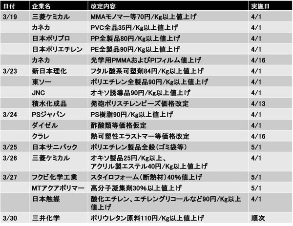 もちろん、生産調整だけでなく、多くの石油化学メーカーでは値上げも実施します。図表7は、3月19日以降に発表された値上げの事例を集めたものですが、値上げの実施が4月1日に集中しており、4月の企業物価指数(5月15日公表)がかなり上振れる可能性を示唆しています。そうなれば、いずれ消費者物価にも波及することが予想されます。