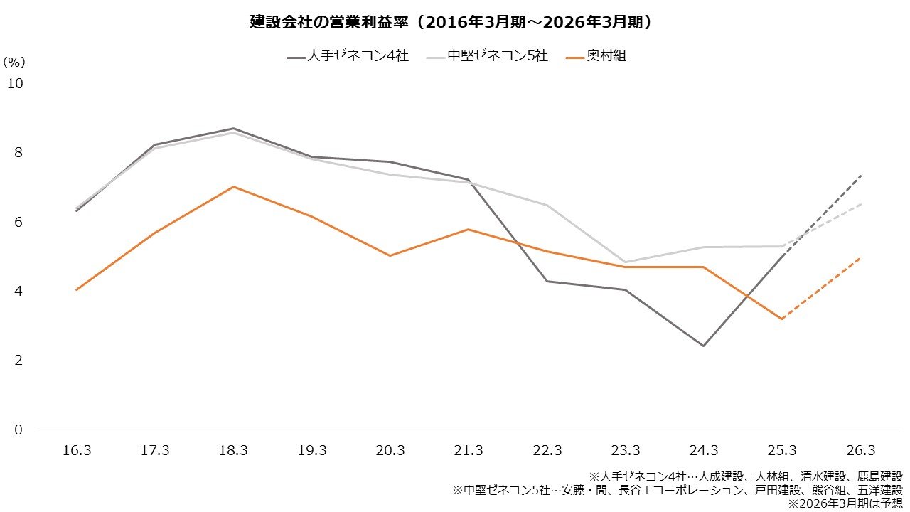 先述のとおり、奥村組は26年3月期に利益が回復する見通しです。しかし、同業他社と比べると利益率には物足りなさもあります。