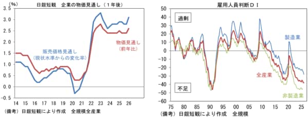 次にインフレ関連項目に目を向けると、企業の物価見通し(全規模・全産業、1年後)は、販売価格見通し(≒自社製品・サービスの価格設定スタンス)が物価見通し(≒日本の物価上昇率)を上回る傾向が続いた。物価見通しの+2.6%に対して、販売価格見通しは+3.1%となっており、ここから判断すると、来年以降も積極的な価格転嫁が続くと予想される。こうした「販売価格見通し>物価見通し」という構図はコロナ期以前には観察されなかった新たなものであり、値上げによって収益を確保する企業行動が定着してきたことを窺わせる。ベア継続や最低賃金上昇といった自社の労働コスト増加に加え、仕入価格の値上げなど、社内外のコスト増を織り込み、3年や5年後の販売価格計画を引き上げる企業行動が背景にあろう。今回、販売価格見通しと物価見通しが共に上向いたことは、日銀の利上げを正当化する。