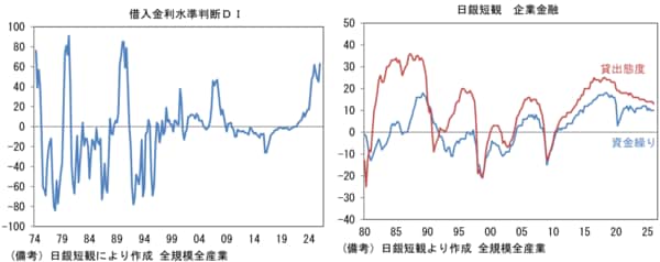 最後に、植田総裁が次回の利上げ判断にあたって注目すると言及していた企業金融関連項目に目を向けると、借入金利水準判断DI(全規模・全産業、以下同じ)が+63へと上昇し、そうしたもとで貸出態度判断DIは+13へと1pt低下し、やや厳格化した。資金繰り判断DIは横ばいを維持した。この指標を見る限り、既往の利上げの累積的な効果は限定的と言える。もっとも、貸出態度判断DIが1桁台に突入するなど、金融引き締めの効果が可視化されてくるようだと、利上げの重要な判断材料になってくるのではないか。