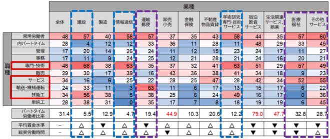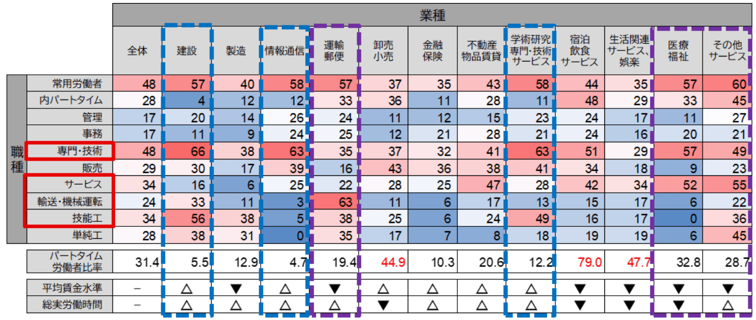この表は、赤色が濃いほど人手不足が深刻で、青色が濃いほど人手が余っている状態を示しています。人手不足の業種のうち、「建設」「情報通信」「学術研究・専門・技術サービス」など、賃金水準と労働時間がともに平均を上回り年収が比較的高い業種では、職種別でみると「専門・技術」や「技能工」に逼迫状況が確認されます。これは、技能やスキル面でのミスマッチが生じていることを示唆しており、リスキリングによる能力向上支援など、人材育成の重要性を改めて示す結果となっています。