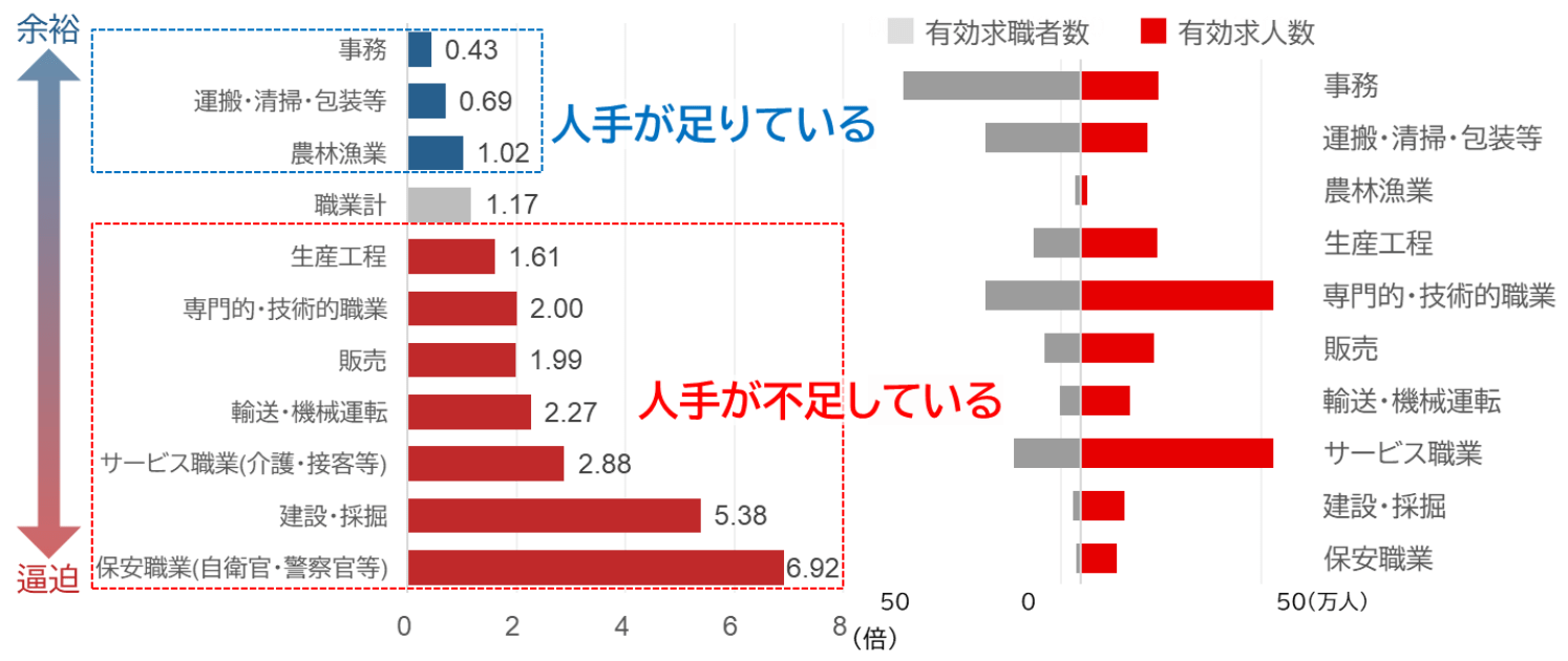 そこで、より身近な求人・求職活動を反映する有効求人倍率を職業従事者別に確認すると、下段の「人手不足業種」と、上段の「人手が足りている業種」の二つに大きく分かれます。特に、人手不足倒産が多い「建設・採掘」は5.18倍と、全体平均の1.10倍を大きく上回り、深刻な状況にあります。一方で、「事務」は0.43倍と全体の半分以下で、むしろ余剰状態にあります。