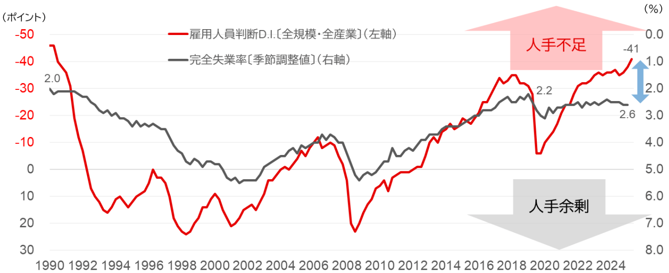 日銀短観の雇用判断DIでは(〔図表5〕の赤線)、2025年12月時点での2026年3月の予測でマイナス41と、1991年9月以来約34年ぶりの深刻な人手不足状況を示しています。