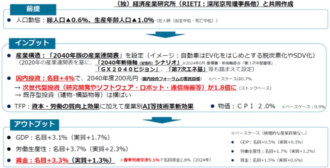 ※2040年新機軸(定性的)シナリオ:人口減少下でもAI・ロボット活用や官民の積極的な投資(2040年までに200兆円)により、一人一人が豊かになれる「成長と分配の好循環」を実現する未来像
