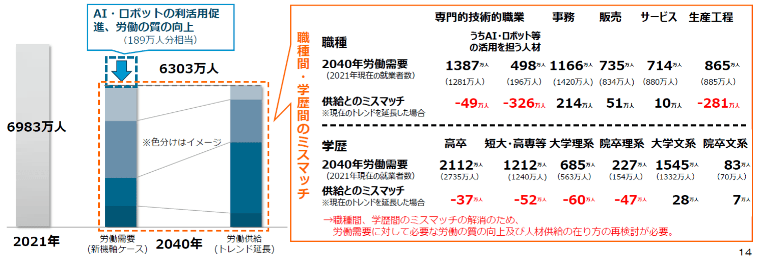 その推計によれば、少子高齢化に伴う人口減少で労働供給は縮小するものの、AI・ロボットの活用促進やリスキリングによる労働の質の向上によって、大きな人手不足は生じないと見込まれています。具体的には、約189万人分の不足を補えるとされており、人手不足が深刻化する可能性は低いと評価しています。